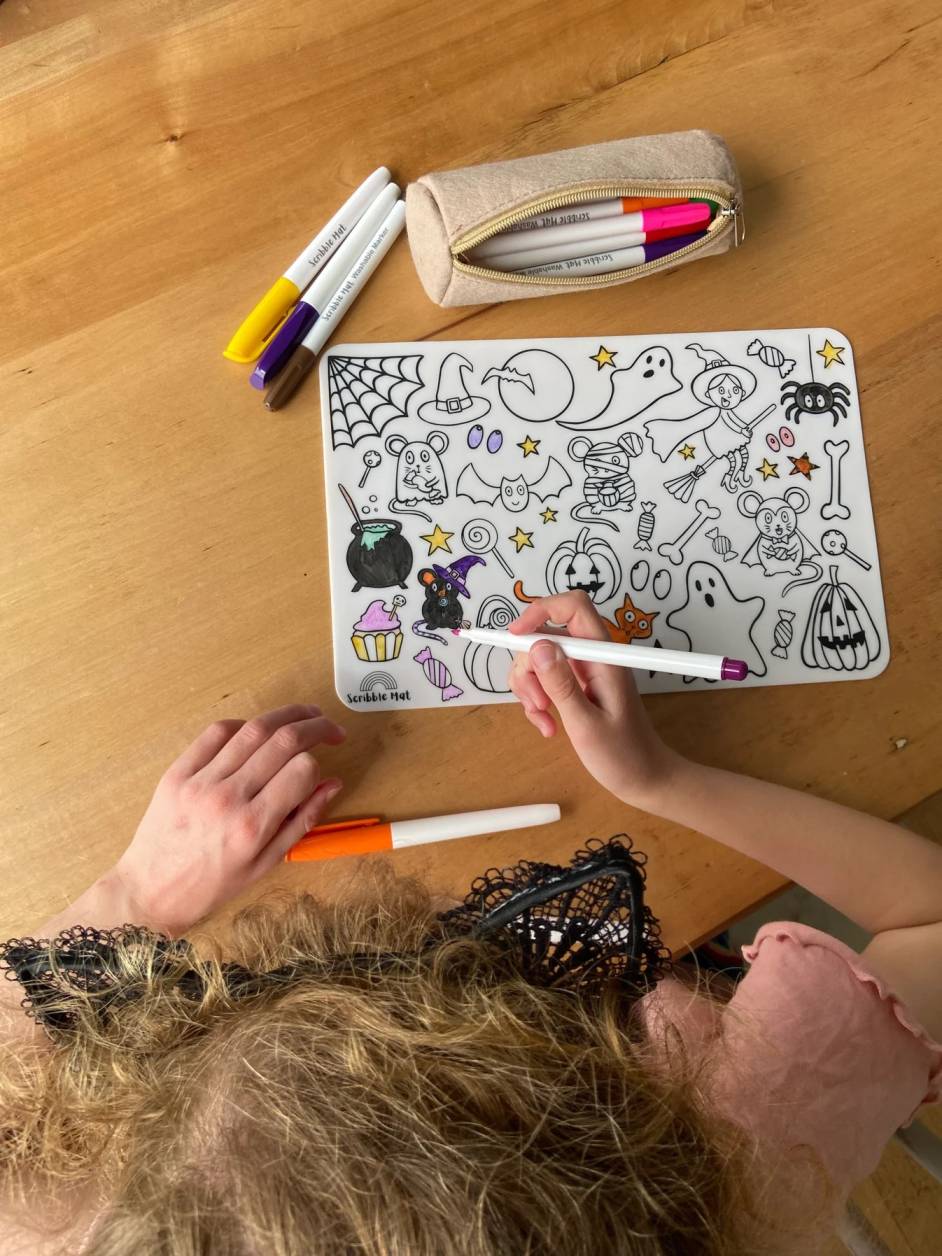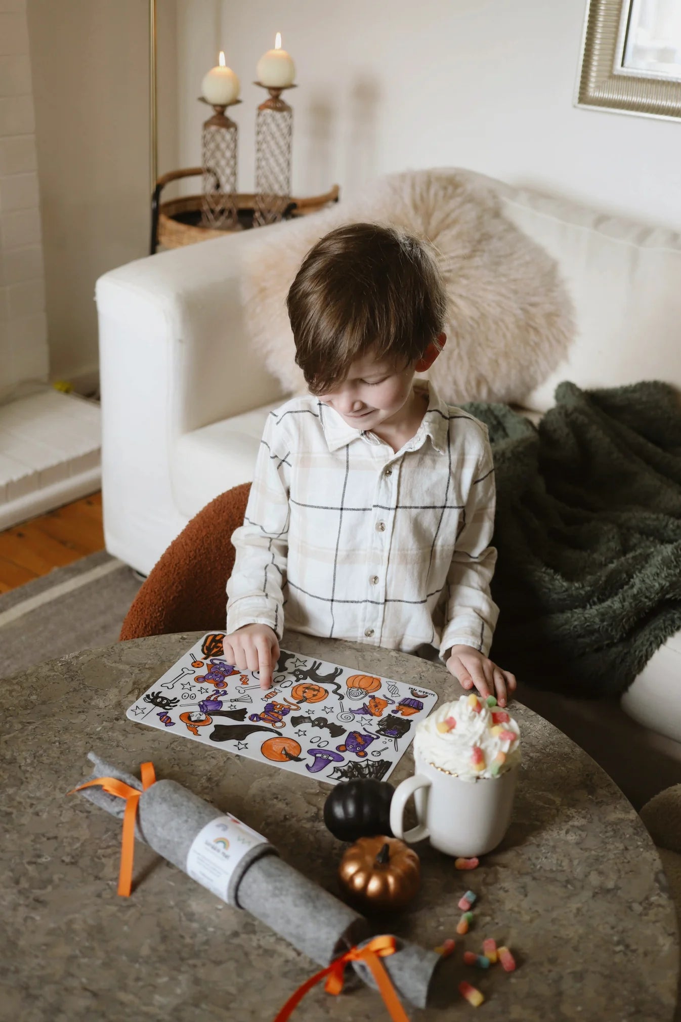 Get ready for the spooky season with our newest reusable colouring mat, Halloween Cracker. This Midi mat features all of your favourite things about Halloween - a wicked witch, spooky bats, playful ghosts, grinning pumpkins and loads of candy - all ready to be decorated with colour!