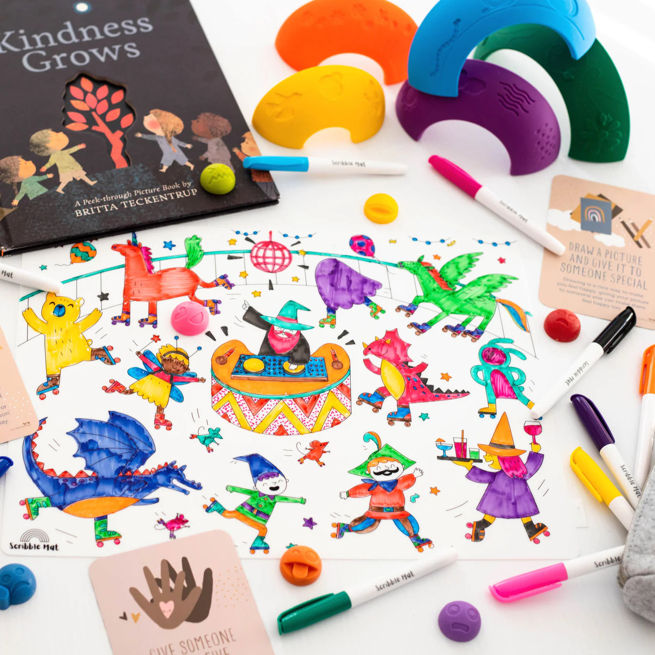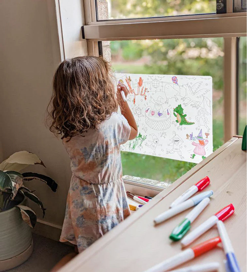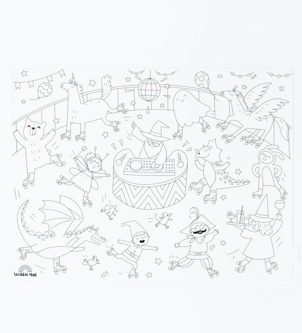 Colour your way around the disco floor with your favourite magical characters in our Everyone’s Invited reusable colouring mat. Everyone is invited to bring their creative flair to the party where a majestic unicorn, graceful fairy, roaring dragon and wicked witch, all groove to the beats of DJ wizard to celebrate inclusivity.